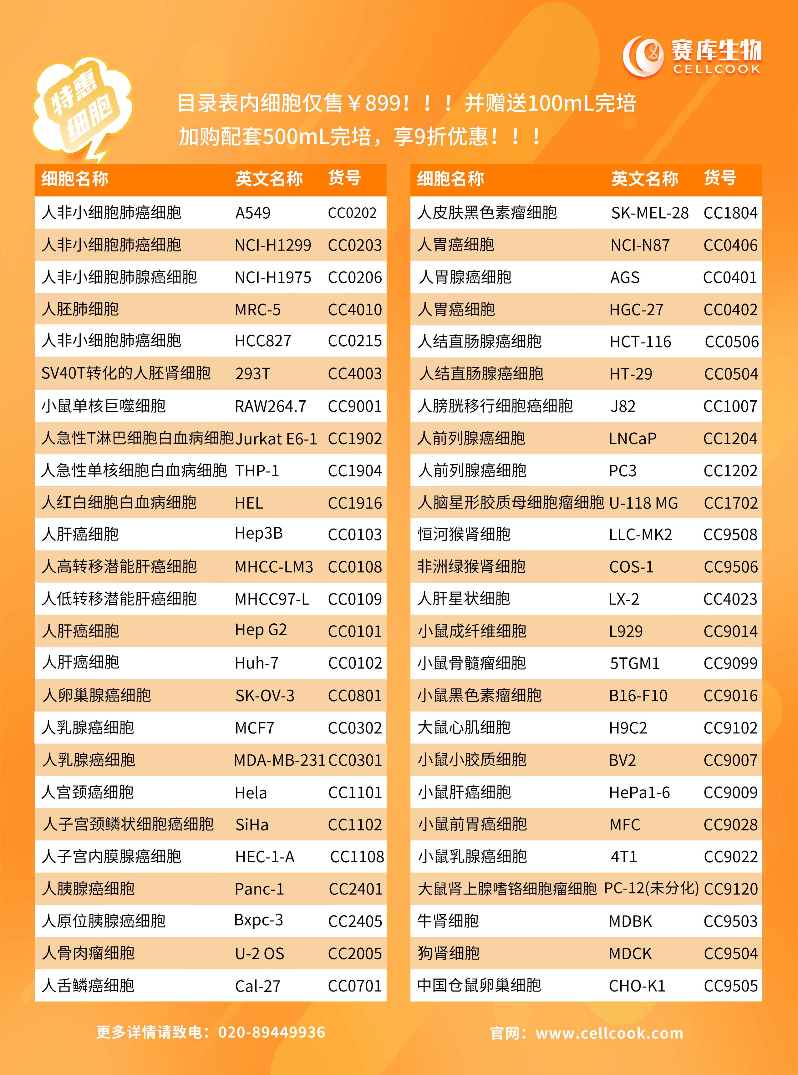 1、目錄表內細胞僅售¥899,贈100mL完培