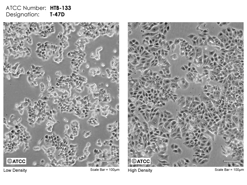 T-47由I Keydar分離自一位54歲乳房侵入性導(dǎo)管癌的女性患者的胸腔積液;分化的上皮亞株(T-47D)有細胞質(zhì)連接和17β雌二醇及其他類固醇激素、降鈣素的受體;表達WNT7B癌基因。