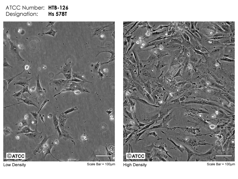 Hs 578T細胞株源自乳房癌。 它與正常成纖維細胞樣細胞株Hs 578Bst起源于同一位患者。Hs 578T細胞株最初是多角形的,但在傳代過程中選擇并克隆了星形的細胞形態(tài)。電鏡下觀察到酪蛋白顆粒聚集,橋粒,緊密連接,脂質體和光滑內質網小泡。與Hs 578Bst一樣,未檢測到雌激素受體和內生病毒。