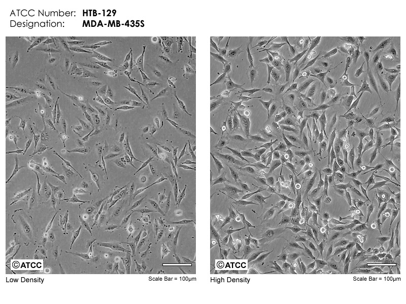 MDA-MB-435S是一種紡錘形的細(xì)胞,1976年由其親本(MDA-MB-435)中篩選得到。MDA-MB-435是從一名31歲的轉(zhuǎn)移性乳腺導(dǎo)管腺癌女性患者胸水中分離得到的。但近來(lái)證明MDA-MB-435細(xì)胞被M14黑色素瘤細(xì)胞污染