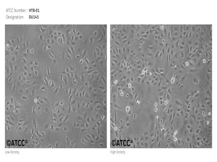DU 145 是從一位有3年淋巴細(xì)胞白血病史的前列腺癌患者的腦部轉(zhuǎn)移灶中建立的。該細(xì)胞系未檢測(cè)到激素敏感性,酸性磷酸酶陽(yáng)性,單個(gè)的細(xì)胞可在軟瓊脂中形成集落。對(duì)此細(xì)胞和原始腫瘤的亞顯微結(jié)構(gòu)分析可見微絨毛、微絲、細(xì)胞橋粒、線粒體、發(fā)達(dá)的高爾基體和異質(zhì)溶酶體。該細(xì)胞不表達(dá)前列腺抗原。