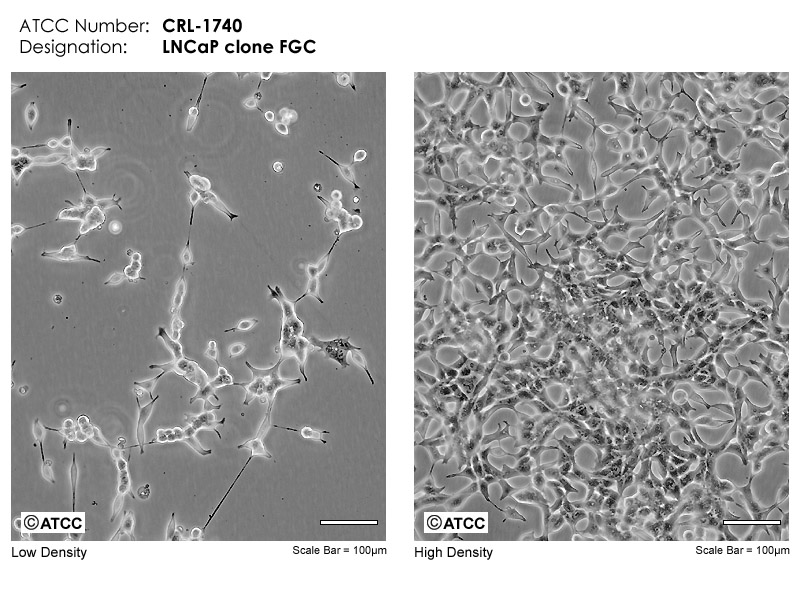 該細胞由Horoszewicz JS于1977年從一名50歲的明確診斷為轉移性前列腺癌的白人男性患者的左鎖骨上淋巴結細針穿刺的活體組織中分離建立的。5-α-雙氫睪酮可影響該細胞的生長和酸性磷酸酶的產生。該細胞不形成均一的單層而是成簇生長,所以傳代的時候要反復吹打形成單個細胞;該細胞貼壁不牢,達不到匯合狀態(tài),而且會使培養(yǎng)基迅速變酸;傳代后48h內一定要保持培養(yǎng)瓶靜止。如果此時挪動培養(yǎng)瓶,會使大部分細胞從瓶底脫落。如果出現此種情況,需要重新孵育24~48h使細胞重新貼壁,細胞貼壁后可更換培養(yǎng)基。
