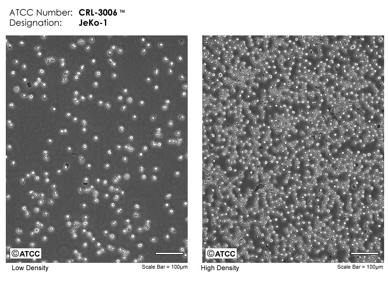 一位套細(xì)胞淋巴瘤患者的巨細(xì)胞變種顯示白血病轉(zhuǎn)變,從其外周血單核細(xì)胞出發(fā)建立了MCL細(xì)胞株JeKo-1。JeKo-1細(xì)胞EB病毒陰性,并表達(dá)一種B細(xì)胞表型的IgM。細(xì)胞過表達(dá)cyclin D1, Bcl-2, c-Myc及Rb蛋白。Bcl-1/J(H)基因重排得到了PCR證實(shí)。JeKo-1細(xì)胞在SCID小鼠中高成瘤。