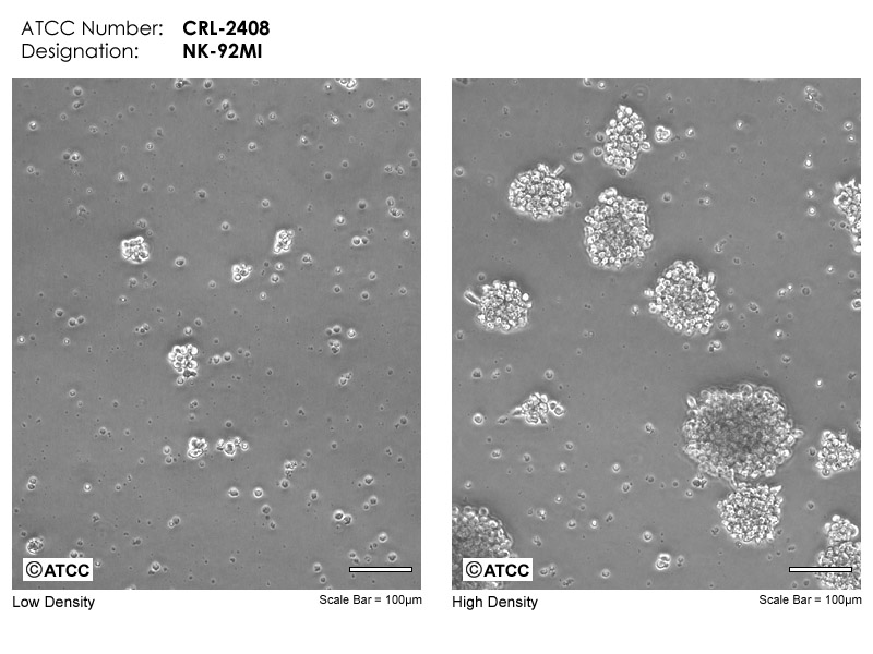 NK-92是從一位患有急進(jìn)性非霍奇金淋巴瘤的50歲白人男性外周血單核細(xì)胞衍生來的一株白細(xì)胞介素-2依賴型NK細(xì)胞株。NK-92MI是轉(zhuǎn)染得到的源自NK-92的IL-2非依賴的NK細(xì)胞株,親本細(xì)胞通過微粒體基因轉(zhuǎn)化法用逆轉(zhuǎn)錄病毒MFG-hIL-2載體攜帶的人IL-2 cDNA進(jìn)行轉(zhuǎn)化。可能由于載體整合到基因組DNA中,轉(zhuǎn)化是穩(wěn)定的。這株細(xì)胞對(duì)很多惡性細(xì)胞有細(xì)胞毒性;鉻釋放試驗(yàn)顯示它能殺死K562和Daudi細(xì)胞。NK-92細(xì)胞有以下特征:CD2,CD7,CD11a,CD28,CD45,CD54和CD56陽性