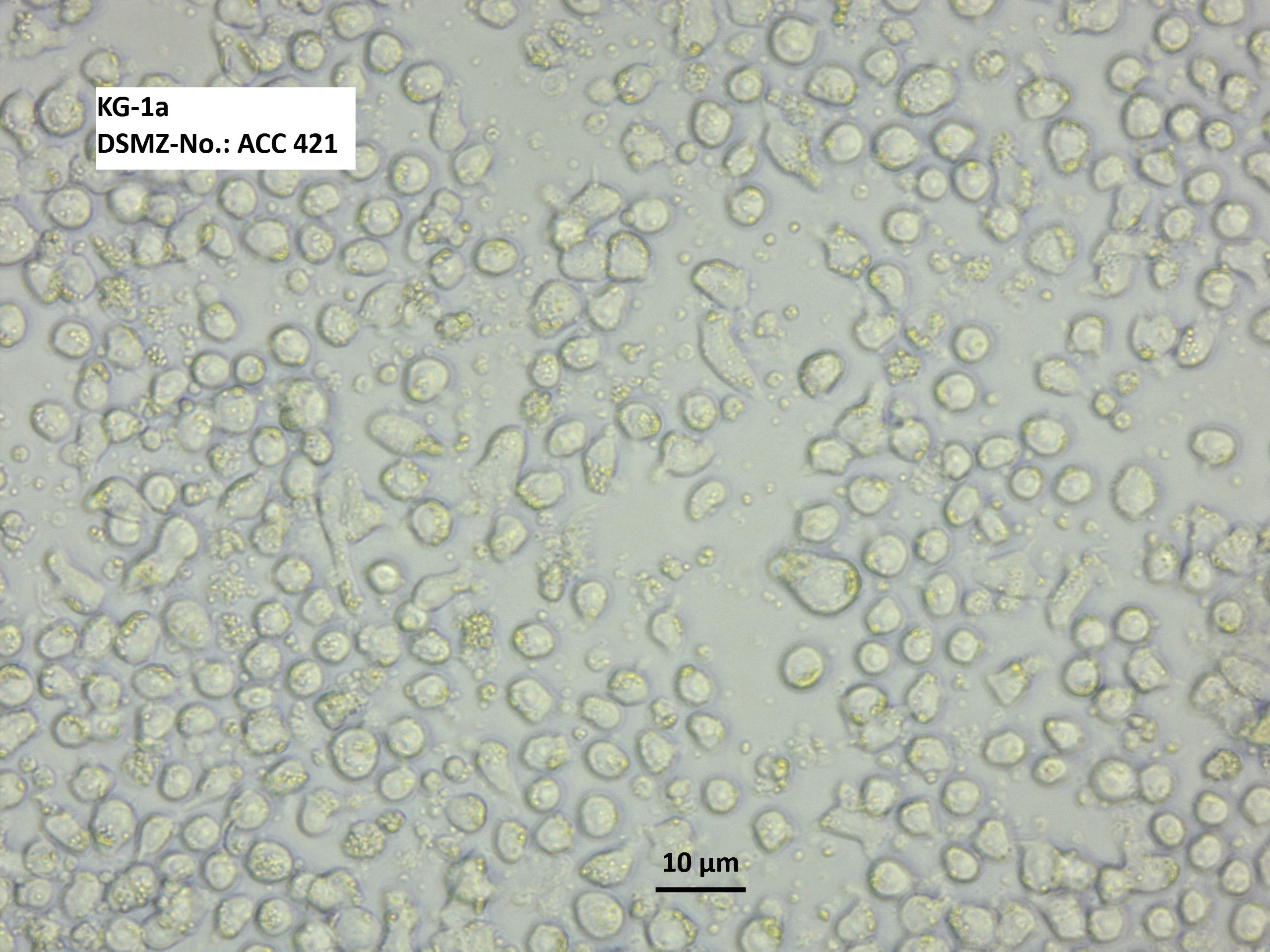 KG1細胞系由H.P.Koeffler和D.W.Golde建立。骨髓抽自一個59歲的患有紅白血病而后又發(fā)展成急性骨髓原性白血病的男性白人。KG1細胞在形態(tài)上類似急性髓原白血病,表現(xiàn)為明顯的多形化,骨髓母細胞和骨髓細胞占優(yōu)勢。少量細胞是成熟的粒細胞,也有微量的巨噬細胞和嗜曙紅細胞。培養(yǎng)35代后表現(xiàn)出與母細胞系不同的形態(tài)特征。亞型KG-1a由未分化的早幼粒細胞組成。相比KG-1細胞,KG-1a在軟瓊脂培養(yǎng)中對集落刺激因子沒反應(yīng),也不表達LA樣抗原。同時對佛波酯誘導(dǎo)的巨噬細胞分化有抵抗作用,佛波酯也不會引起細胞
