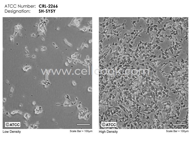 該細(xì)胞系來源于1970年建立的一神經(jīng)母細(xì)胞瘤患者的轉(zhuǎn)移骨瘤灶細(xì)胞SK-N-SH經(jīng)三次克隆后的亞系(SK-N-SH→SH-SY→SH-SY5→SH-SY5Y)。該細(xì)胞顯示中等水平的多巴胺-β-羥基酶活性。SH-SY5Y細(xì)胞的生長密度可高達(dá)1X106細(xì)胞/cm2,生長成懸浮和貼壁混合生長,有的聚集成細(xì)胞叢。