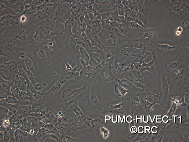 HUVEC-T1形態(tài)呈現(xiàn)為典型的鵝卵石樣排列,已證明在體外可傳至40代。PUMC-HUVEC-T1內(nèi)皮標(biāo)記vWF、CD31、CD34均陽性,可結(jié)合凝集素,電鏡下可見緊密連接和W-P小體,Matrigle上可形成管型。不同代數(shù)的HUVEC-T1細(xì)胞核型正常穩(wěn)定(P12、P13、P19、P38),裸鼠體內(nèi)接種不成瘤(P9和P33)。