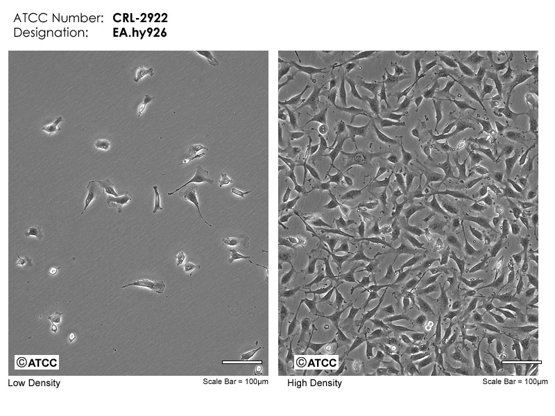 在PEG脅迫下,將原代培養(yǎng)的人臍靜脈細(xì)胞與抗硫鳥(niǎo)嘌呤的A549克隆株融合,構(gòu)建了人臍靜脈細(xì)胞株, EA.hy926。 融合子在HAT培養(yǎng)基上生長(zhǎng)并以八因子相關(guān)抗原篩選。 EA.hy926已經(jīng)過(guò)100次以上的群體倍增(PDLs)。 電鏡照片顯示W(wǎng)eibel-Palade小體的細(xì)胞質(zhì)分布以及組織特異性的細(xì)胞器,分化的內(nèi)皮細(xì)胞特性如血管生成,體內(nèi)平衡/血栓形成,血壓及炎癥反應(yīng)。