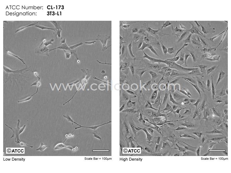 3T3-L1是從3T3細(xì)胞(Swiss albino)中經(jīng)克隆分離得到的連續(xù)傳代的亞系。該細(xì)胞從快速分裂到匯合和接觸性抑制狀態(tài)經(jīng)歷了前脂肪細(xì)胞到脂肪樣細(xì)胞的轉(zhuǎn)變。該細(xì)胞鼠痘病毒陰性;可產(chǎn)生甘油三酯,高濃度血清可增強(qiáng)細(xì)胞內(nèi)脂肪堆積。